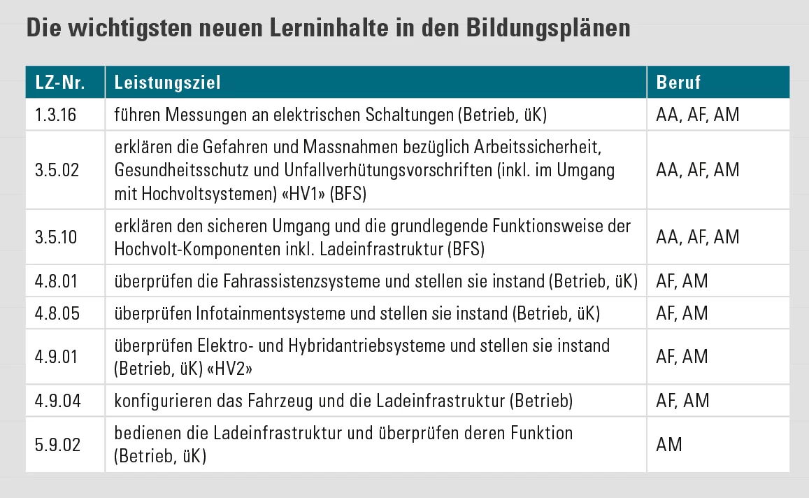 Die Teilrevision reagiert auf die rasante technische Entwicklung in Bereichen wie der Elektromobilität und alternativen Antriebssystemen. Besonders im Bereich «Hybrid- und Elektroantrieb» wurden in allen drei Grundbildungen die Inhalte angepasst. Bei AF wurden neue Handlungskompetenzen im Bereich «Überprüfen und Reparieren von Systemen» aufgenommen. Neu sollen AF unter anderem Fahrassistenz- und Infotainmentsysteme sowie Elektro- und Hybridantriebe reparieren können.