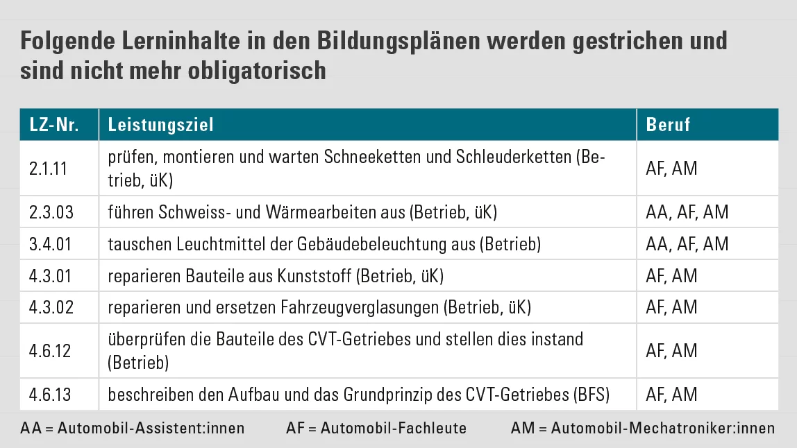 Bei den QV kommt es ebenfalls zu Neuerungen. Für die AA entfällt künftig die schriftliche Berufskenntnisprüfung. Stattdessen wird das Fachgespräch von der Dauer von 30 Minuten zu den praktischen Arbeiten mitgezählt. Die praktischen Prüfungszeiten hingegen bleiben mit 50 Minuten pro Prüfungsstation bei allen Berufen unverändert. «Alle Systeme im Fahrzeug sind wichtig – deshalb braucht es für jeden Prüfungsbereich ausreichend Zeit», betont Schöpfer. Ziel sei es, dass die revidierte BiVo und die Lehrpläne am 1. Januar 2026 in Kraft treten und beim Lehrbeginn im Sommer 2026 erstmals zum Zug kommen.