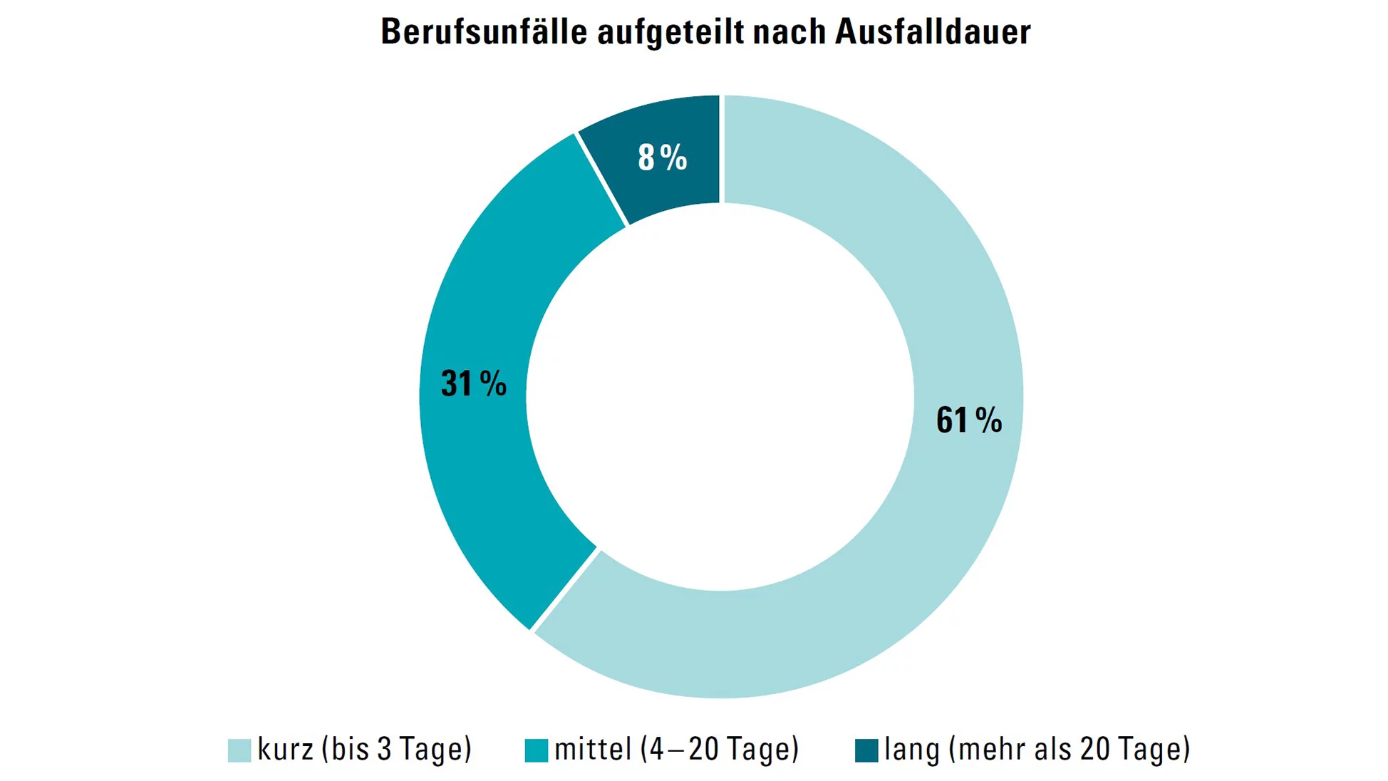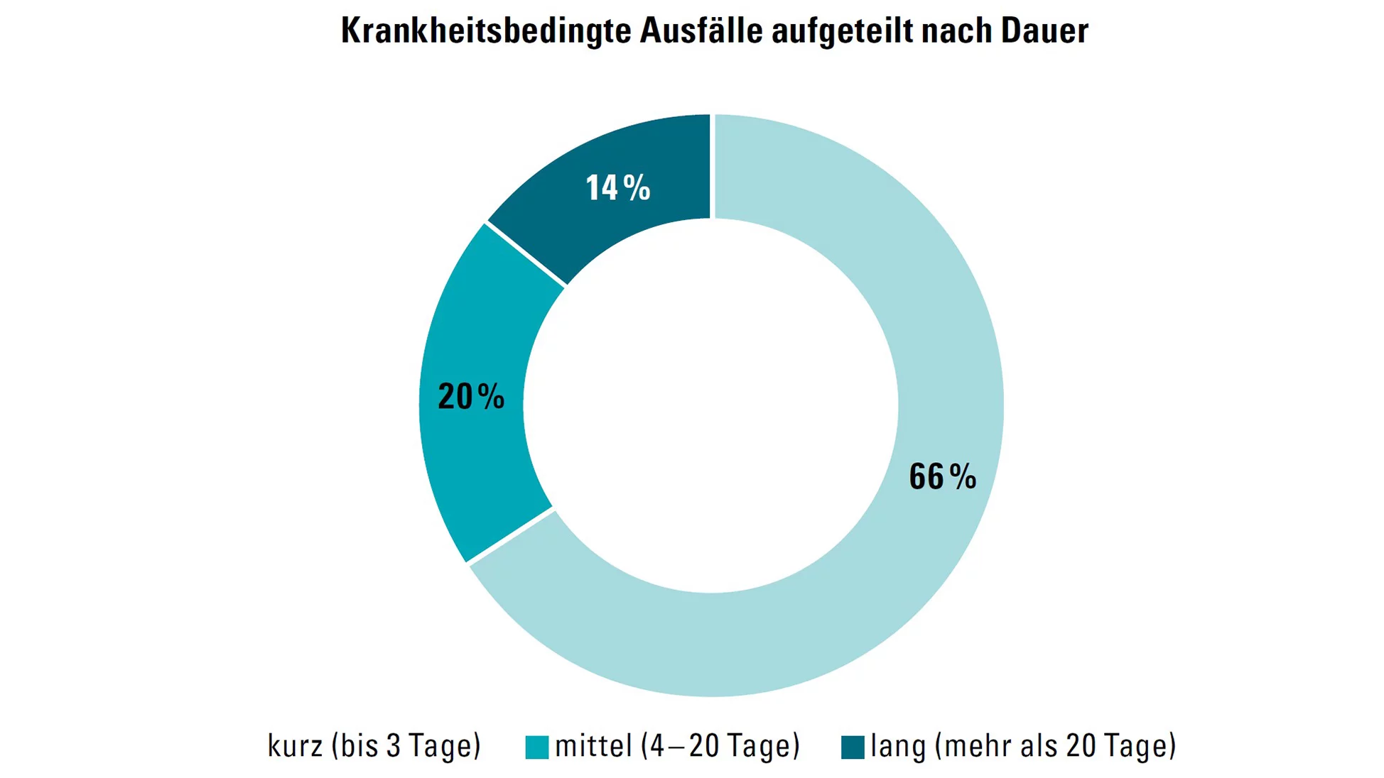 Die Auswertung der Krankheitsdauer zeigt, dass die grosse Mehrheit der Absenzen nur kurz dauert: 66 Prozent der Krankheitsfälle führen zu Ausfällen von höchstens drei Tagen. Weitere 20 Prozent dauern zwischen vier und zwanzig Tagen. Längere Krankheitsabsenzen von mehr als 20 Tagen machen mit 14 Prozent nur einen vergleichsweisen kleinen Anteil aus. Insgesamt zeigt sich damit, dass die meisten krankheitsbedingten Ausfälle kurzfristig bleiben und längere Abwesenheiten deutlich seltener auftreten.