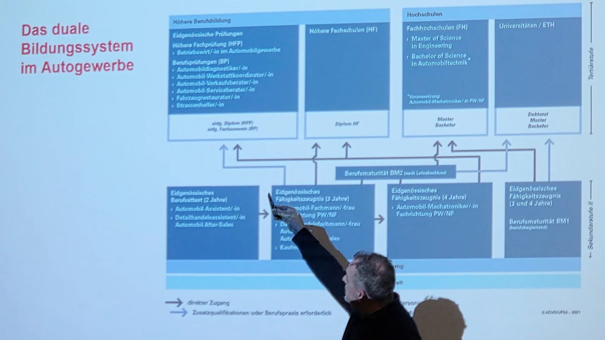 Mit dem Autoberufe-Karriereabend unterstreicht der AGVS sein kontinuierliches Engagement für die Förderung von Nachwuchs- und Fachkräften. Von eidgenössischen Fachausweisen über die höhere Fachprüfung bis hin zu weiterführenden Qualifikationen stehen im Autogewerbe vielfältige Karrierewege offen. Die Förderung von Nachwuchskräften und erfahrenen Fachleuten bleibt für den AGVS ein zentrales Anliegen. Dank der Durchlässigkeit des Schweizer Berufsbildungssystems stehen Berufsleuten aus dem Autogewerbe nämlich dieselben Chancen offen wie Absolvent:innen einer Universität oder Hochschule.