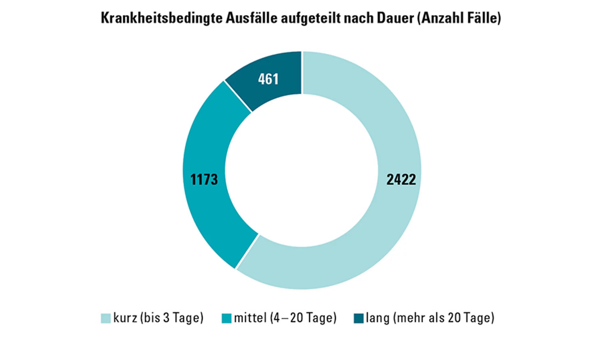 Ein weiteres zentrales Ergebnis der Umfrage betrifft krankheitsbedingte Ausfälle. Besorgniserregend: In den Unternehmen wurden insgesamt rund 29 000 Krankheitstage gezählt. Besonders auffällig ist, dass die Zahl der über 20 Tage andauernden Ausfälle kontinuierlich steigt, was auf eine zunehmende Schwere von Krankheitsfällen hinweist.