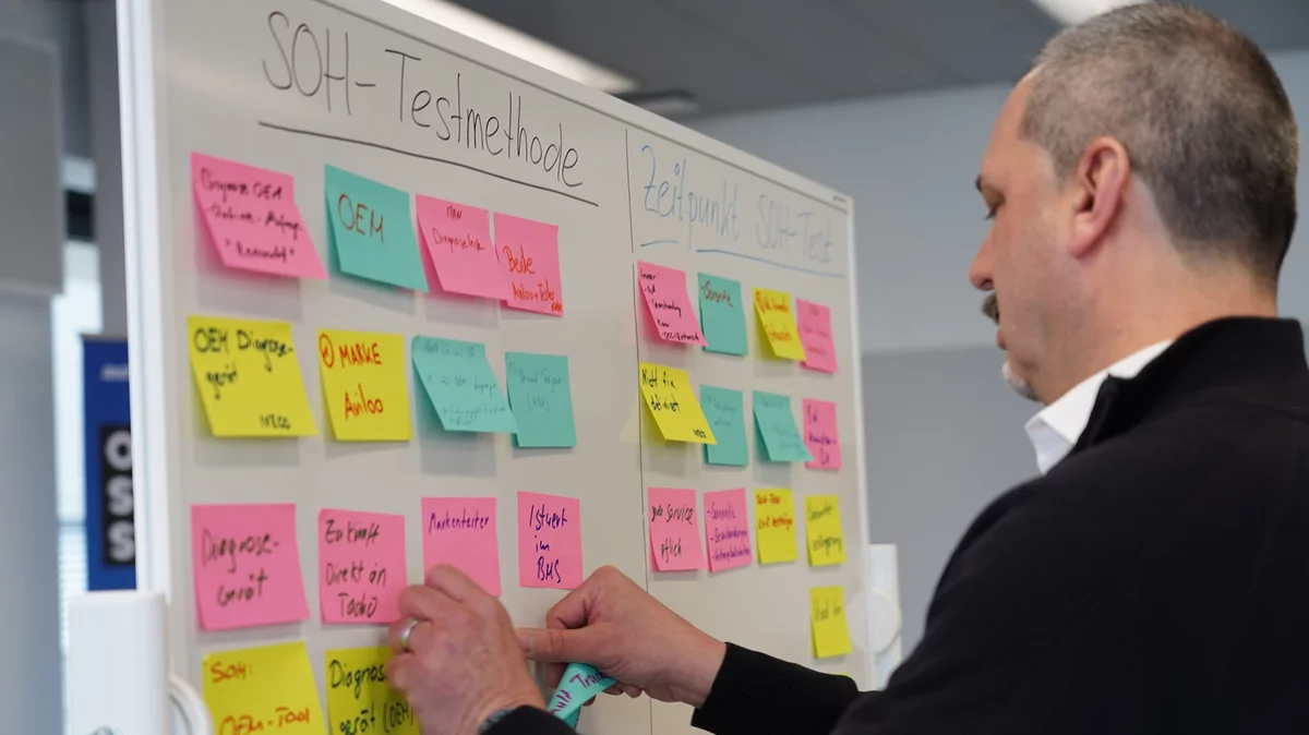Apropos Hochvolt: Zwischendurch gab es eine Umfrage unter den Teilnehmenden mittels Post-it-Zetteln. Unter anderem wurde gefragt, wie der State of Health (SOH) von E-Auto-Batterien ermittelt wird. Ergebnis: Es dominieren Herstellertests, gefolgt von Aviloo. Hintergrund, so Peter: «Voraussichtlich ab März können bei uns SOHs in einer den AGVS-Garagen zur Verfügung gestellten Plattform eingetragen werden – um Aussagen zu erhalten etwa zum durchschnittlichen SOH eines Modells nach soundso vielen Kilometern.» Peter ergänzte: «Bei den Occasionen sollte der SOH-Test Standard werden, um so das Vertrauen in E-Occasionen zu stärken und den Handel zu beleben.»