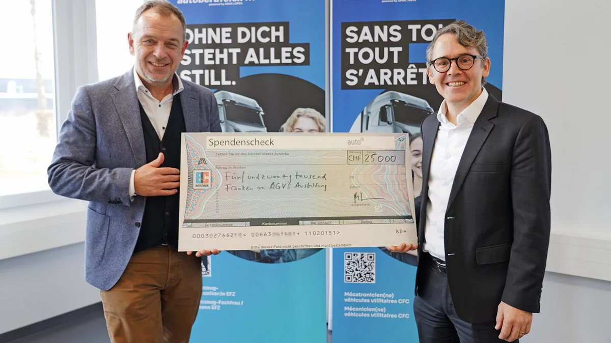 In einem Referat von Luigi Cescato (Auto-Schweiz, Technik und Statistik) wurden Verkaufszahlen und CO2-Strafen angesprochen und Massnahmen wie ein Leitfaden, der die Beurteilung und Handling von E-Auto-Batterien nach Unfällen beschleunigen soll. Schliesslich bat Olivier Maeder Philipp Zimmermann, CEO von Auto-i-Dat (übrigens Platin-Partner des «Tags der Schweizer Garagen»), zu sich. Zimmermann überreichte einen Scheck über 25'000 Franken für die Bildung. «Die Aus- und Weiterbildung unterstützen wir gerne, sie liegt uns am Herzen», so Zimmermann, «weil sie die Zukunft unserer Branche sicherstellt.»