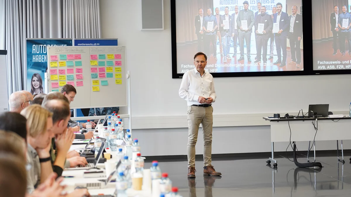 Weiter ging es um Revisionen bei diversen Autoberufen. Der Lehrgang Automobil-Verkaufsberater:in EFZ zum Beispiel wird, erläuterte Christoph Künzi (AGVS, Höhere Berufsbildung), ab dem zweiten Semester 2026 überarbeitet und Automobil-Serviceberater:in EFZ per Januar 2026 auch in der Romandie angeboten. Bei Fahrzeugrestaurator:in gibt es ab Herbst 2026 zusätzlich eine zweite Fachrichtung, die «Ältere Automobiltechnk» wird überarbeitet und neu die «Jüngere Automobiltechnik» (1976 bis 1996) eingeführt. Warum? «Ab den 1980er-Jahren wurden die Fahrzeuge mit Elektronik vollgestopft», so Künzi, der anfügte: «Falls Sie alte Schulungsmodelle oder technische Unterlagen aus der Zeit haben, wären wir interessiert.»
