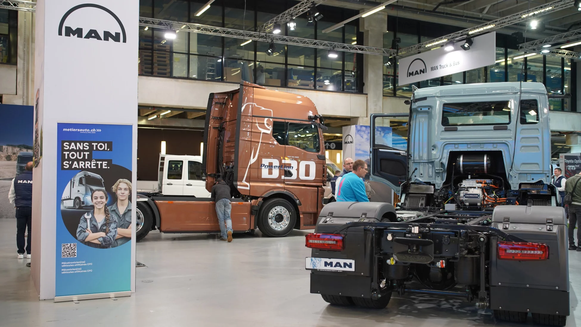 Schon in seiner Eröffnungsrede wies beispielsweise OK-Präsident und AGVS-Vizepräsident Dominique Kolly auf den neuen Slogan «Ohne dich steht alles still.» hin. Zusammen mit den Importeuren will man damit künftig Schülerinnen und Schüler noch gezielter auf die AGVS-Nutzfahrzeugberufe aufmerksam machen. «Guter Nachwuchs ist für unsere Branche eine Kernfrage. Daher hat eine neue Allianz aus grossen Importeuren und dem AGVS ihre Kräfte gebündelt und geht mit gemeinsamer Kraft und einem neuen Slogan selbstbewusst voran, um Nachwuchskräfte für unsere Branche zu gewinnen», unterstrich Kolly. Tatsächlich – ob bei DAF, Daimler Trucks, Iveco, MAN, Renault Trucks, Scania oder auch Volvo Trucks – überall war das neue Keyvisual zu finden und sorgte so für einen sehr starken Auftritt an der alle zwei Jahre stattfindenden Fachmesse für Nutzfahrzeuge und den Automobil-Werkstattbedarf.