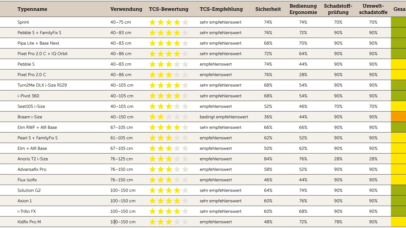 Obwohl die Anforderungen in diesem Jahr verschärft wurden, schlossen die meisten Modelle mit sehr guten Benotungen ab. Nur ein Sitz wurde aufgrund einer Schwachstelle im Falle eines Unfalls als «bedingt empfehlenswert» eingestuft, während ein anderer aufgrund seines Schadstoffgehalts (PFAS) abgestraft wurde.