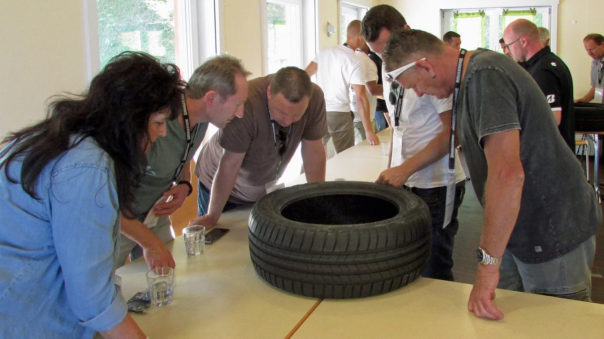 In den Workshops galt es, bei zwei heiklen Themen rund um Autoreifen mehr Informationen und Erfahrungen zu sammeln. Zwar gehört der moderne Autoreifen heute trotz der hohen Belastung im Fahrbetrieb zu den zuverlässigsten Fahrzeugkomponenten, doch sollten der Reifendruck und die Profiltiefe stets im Auge behalten werden. Bleibt beispielsweise der Reifenfülldruck vor der Ferienreise mit Familie und Gepäck unbeachtet, kann zu niedriger Druck während der Autobahnfahrt zu Hitzeschäden und sogar zu Reifenplatzern führen. Auch zu geringe Profiltiefe in der Lauffläche kann zu gefährlichen Situationen führen. Schon die gesetzlich geforderten 1,6 Millimeter sind auf regen- oder schneenasser Fahrbahn nicht mehr genügend.
