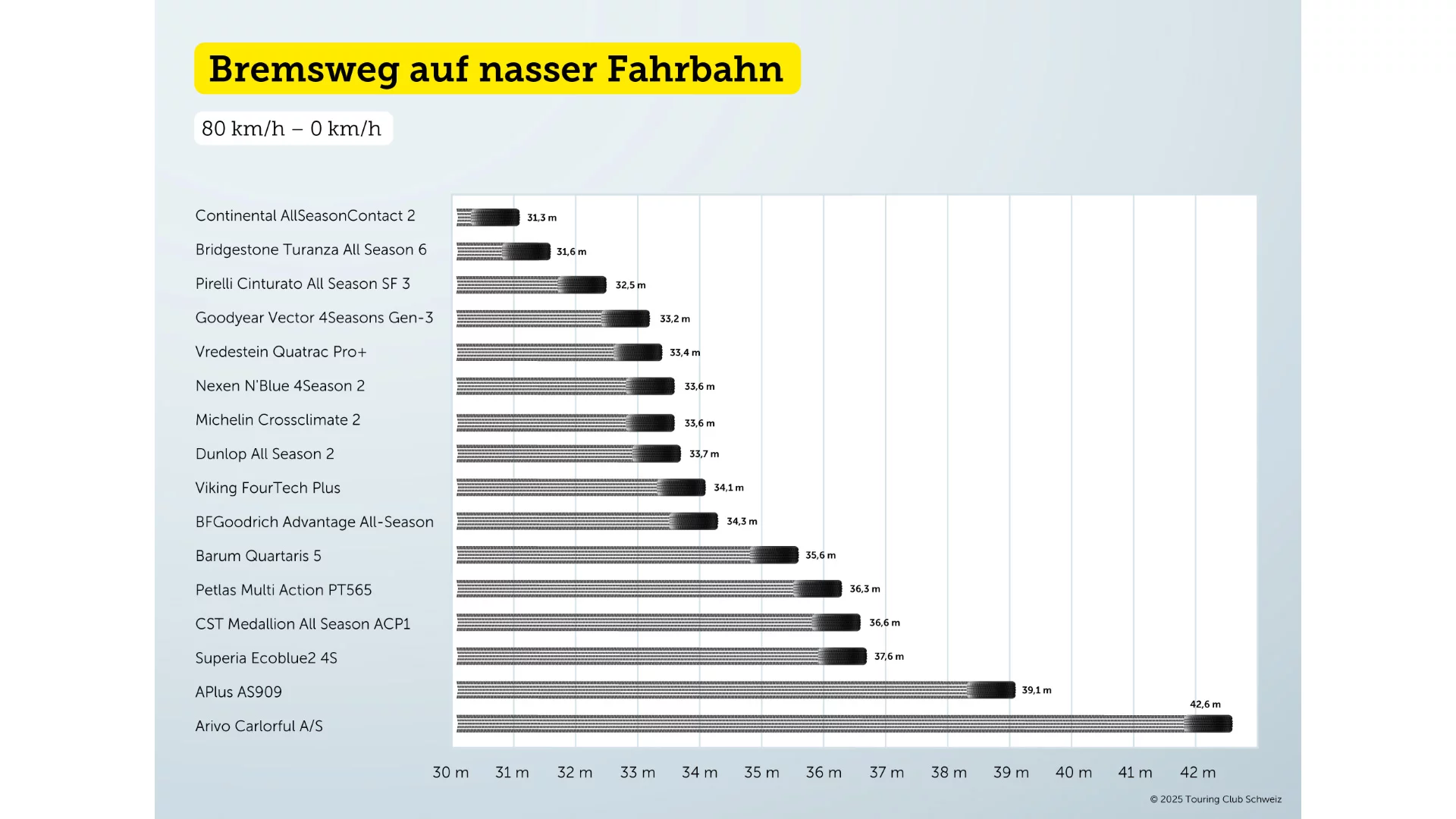 Die Bremstests zeigen erhebliche Unterschiede zwischen den Reifen. Auf trockener Fahrbahn kommt ein mit Pirelli Cinturato All Season SF II Reifen ausgestattetes Fahrzeug bei einer Geschwindigkeit von 100 km/h nach 38 Metern zum Stehen. Bei Barum Bravuris 5HM Reifen sind hingegen 7,3 Meter mehr erforderlich, um das Fahrzeug vollständig zum Stehen zu bringen. Das bedeutet, dass das mit den Pirelli-Reifen ausgestattete Fahrzeug bereits zum Stillstand gekommen ist, während das Fahrzeug mit den Barum-Reifen noch eine Restgeschwindigkeit von ca. 40 km/h hat.