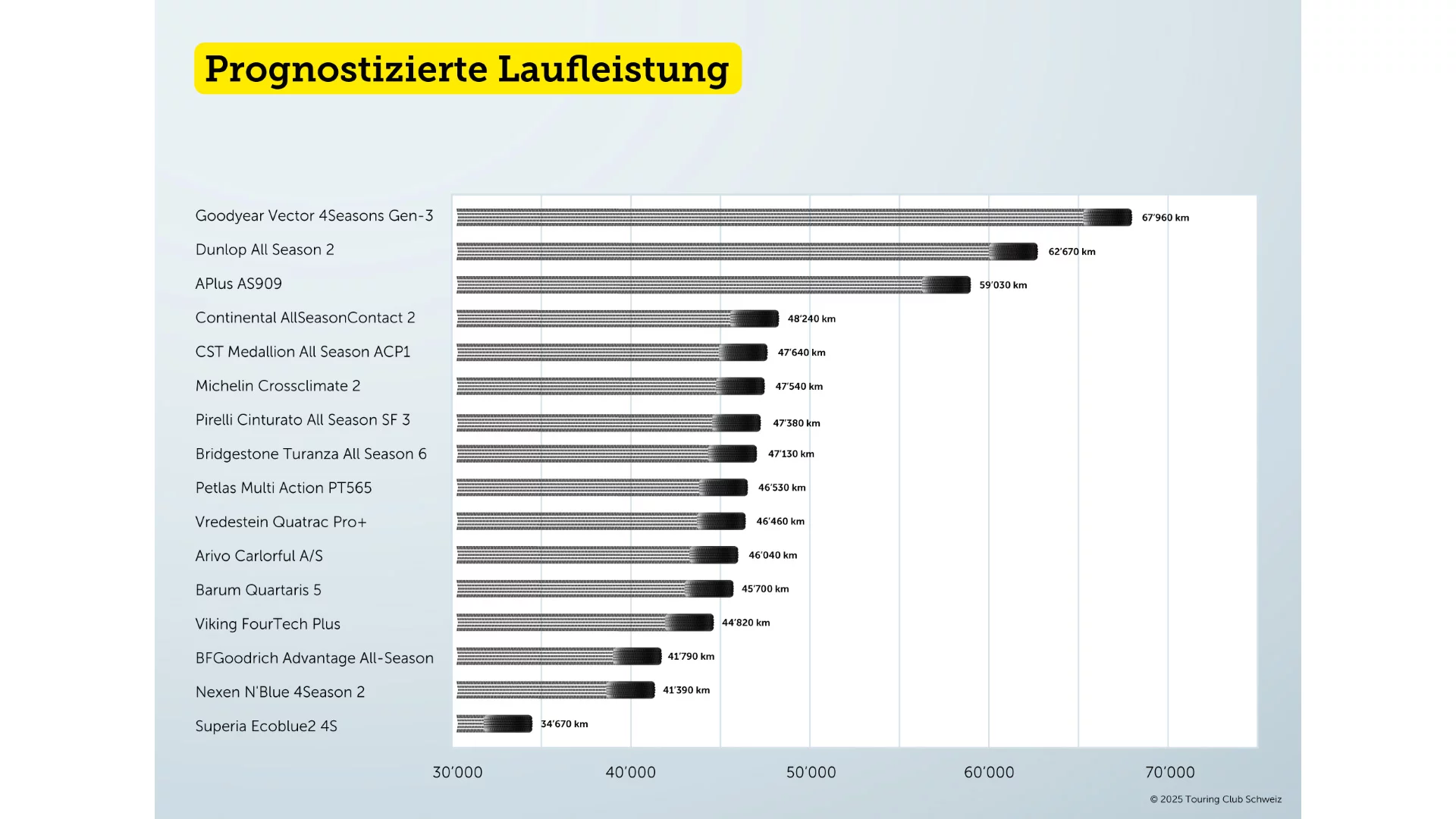 Ein guter Ganzjahresreifen zeichnet sich nicht nur durch seine Leistung auf trockener, nasser oder verschneiter Fahrbahn aus, sondern muss auch eine lange Lebensdauer gewährleisten. Ein wesentliches Kriterium ist die Umweltbilanz, die den Treibstoffverbrauch, das Gewicht, den Geräuschpegel sowie die voraussichtliche Laufleistung und den Verschleiss des Reifens berücksichtigt. Die Reifen mit den Bestnoten vereinen dabei Performance und Umweltfreundlichkeit. Gemäss den Tests des TCS können einige Modelle bis zu doppelt so viele Kilometer zurücklegen, bevor sie ersetzt werden müssen. So hat beispielsweise der Goodyear Vector 4 Seasons Gen 3 eine geschätzte Lebensdauer von fast 68’000 Kilometern, im Vergleich zu etwas mehr als 34’000 Kilometern beim Superia Ecoblues 45. Am besten bewertet werden somit die Reifen, die sowohl Sicherheit als auch Langlebigkeit garantieren.
