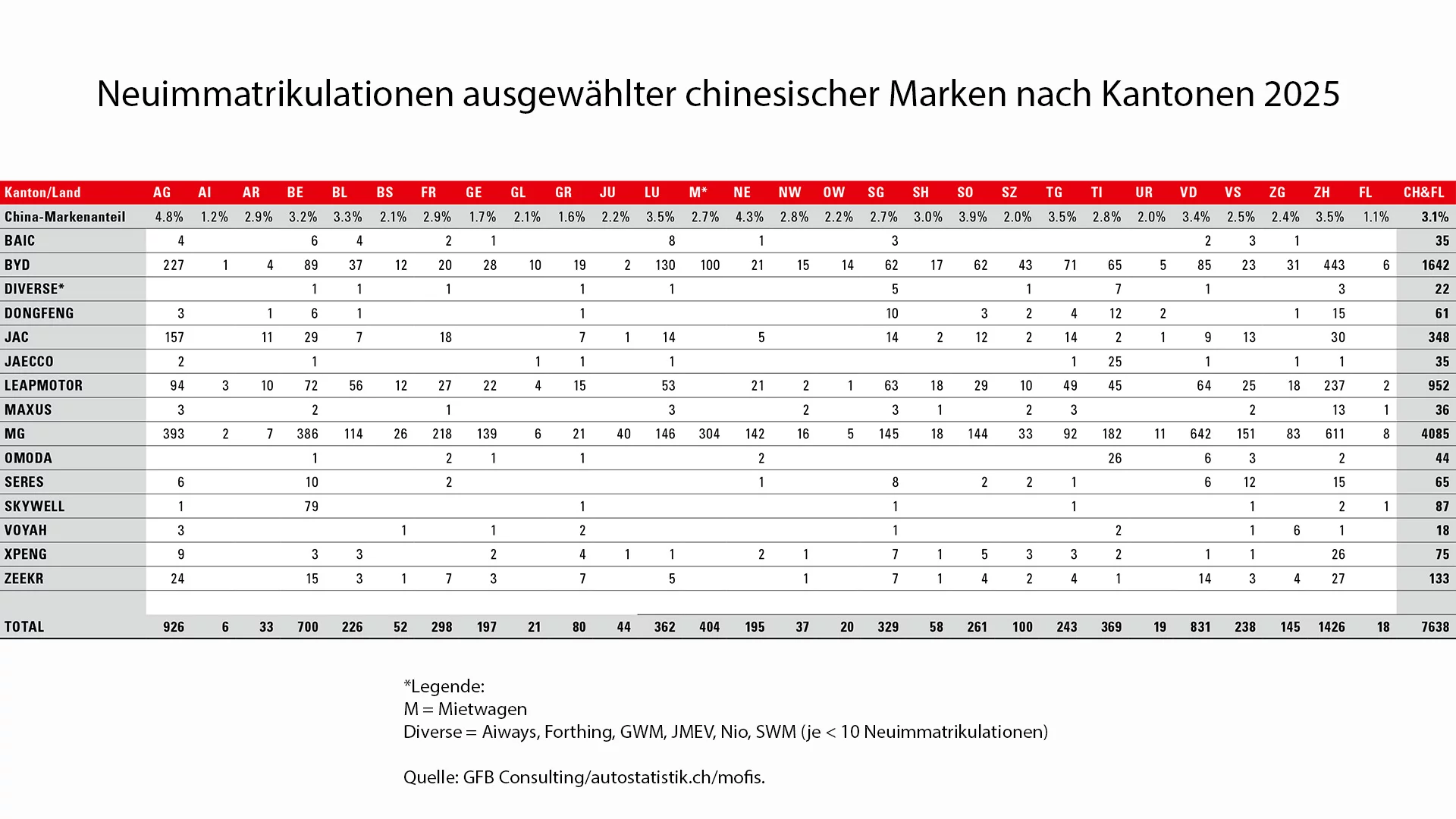 Für die AGVS-Medien hat Biffiger die 2025er-Zahlen nach Kantonen aufgeschlüsselt, um aufzuzeigen, wo die Präsenz der neuen Marken in der Schweiz und dem Fürstentum Liechtenstein Stärken oder Lücken aufweist. «Überdurchschnittlicher Nachfrage erfreuten sich die neuen chinesischen Marken mit 4,8 Prozent Anteil im Aargau, mit 4,3 Prozent in Neuenburg, mit 3,9 Prozent im Kanton Solothurn und mit je 3,5 Prozent in den Kantonen Zürich, Luzern und Thurgau», so Biffiger. «Kaum Interesse bestand im Fürstentum Liechtenstein mit 1,1 Prozent und im Kanton Appenzell Innerrhoden mit 1,2 Prozent.» Übrigens: Mietwagen weist Biffiger in seiner Analyse separat aus (Spalte «M») und stellt fest: «MG mit 304 und BYD mit 100 Immatrikulationen gelang es sofort, im Mietwagenbusiness Fuss zu fassen.» Übrigens: Die Topseller der drei grössten neuen Marken waren bei BYD (1642 Immatrikulationen) Seal U (894) und Sealion 7 (324), bei Leapmotor (952) die Modelle T03 (497) und C10 (362) und bei MG (4085) die beiden SUV ZS (1298) und HS (1126).