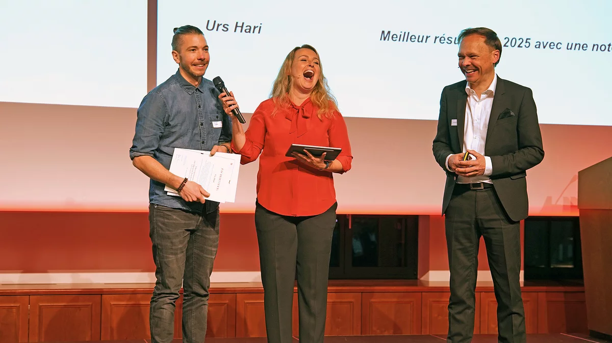 Benno Köppel, gestionnaire d'entreprise, a ensuite fait rire l'assemblée en recevant son diplôme parfaitement habillé et en se faisant féliciter par Havel pour sa tenue. « Il y a trois ans, lors de ma dernière remise de diplôme, je me tenais ici, sans cravate, et je l'ai regretté – c'est pourquoi je porte aujourd'hui une cravate », a déclaré le jeune homme originaire d'Altstätter. Il a toutefois admis qu'il s'habillait « normalement » au travail et a ajouté : « Je ne porte un costume que pour me marier et aujourd'hui, ici, avec toi, Nina. » Ce qui a presque mis la présentatrice dans l'embarras. Elle a pu inviter deux étudiants à monter sur scène pour recevoir les meilleures notes en gestion d'entreprise, car Steven Jost et Fabian Meier ont tous deux obtenu une excellente moyenne de 5,1.