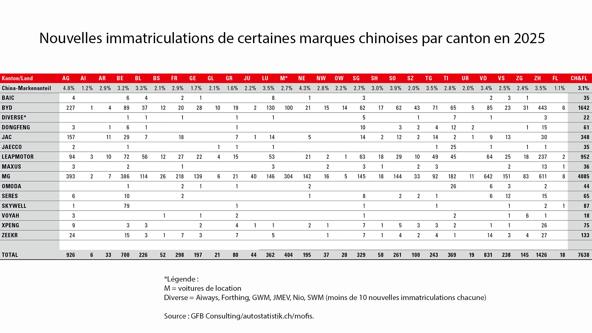 Pour les médias de l’UPSA, Biffiger a ventilé les chiffres de 2025 par canton afin de montrer où la présence des nouvelles marques en Suisse et dans la Principauté du Liechtenstein présente des atouts ou des lacunes. « Les nouvelles marques chinoises ont bénéficié d’une demande supérieure à la moyenne, avec une part de marché de 4,8 % en Argovie, de 4,3 % à Neuchâtel, de 3,9 % dans le canton de Soleure et de 3,5 % dans chacun des cantons de Zurich, Lucerne et Thurgovie », explique M. Biffiger. « L'intérêt était quasi nul dans la Principauté du Liechtenstein (1,1 %) et dans le canton d'Appenzell Rhodes-Intérieures (1,2 %). » À noter : M. Biffiger distingue les voitures de location dans son analyse (colonne « M ») et constate : « MG, avec 304 immatriculations, et BYD, avec 100 immatriculations, ont immédiatement réussi à s’imposer sur le marché de la location de voitures. » À noter également : les modèles les plus vendus parmi les trois plus grandes nouvelles marques étaient, chez BYD (1642 immatriculations) : la Seal U (894) et la Sealion 7 (324) ; chez Leapmotor (952) : les modèles T03 (497) et C10 (362) ; et chez MG (4085) : les deux SUV ZS (1298) et HS (1126).
