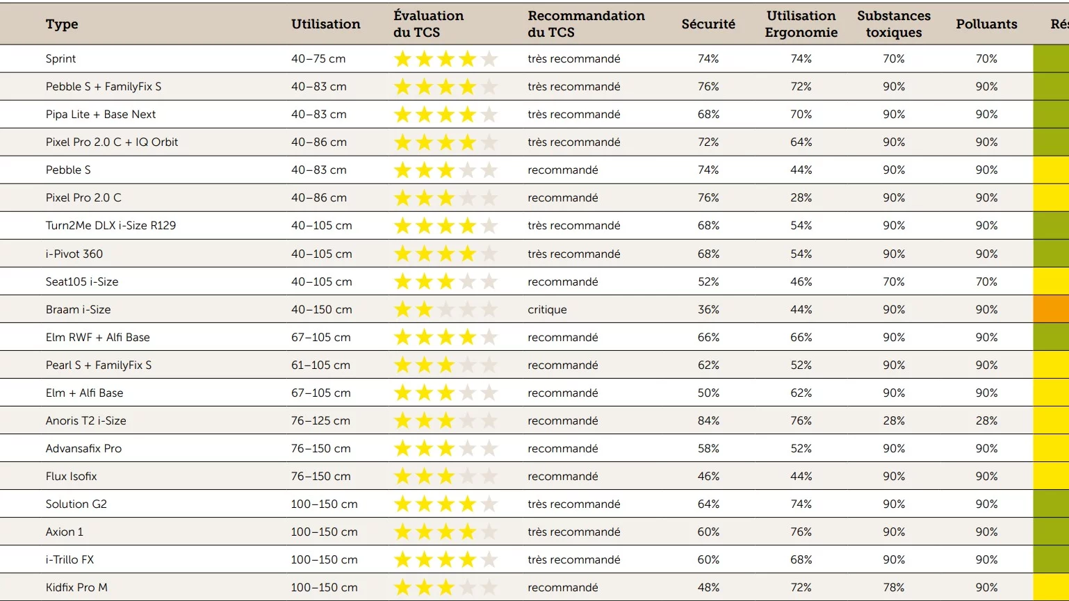 Bien que les exigences aient été renforcées cette année, la plupart des modèles ont obtenu de très bonnes notes. Un seul siège a été jugé « recommandable sous réserve » en raison d'une faiblesse en cas d'accident, tandis qu'un autre a été sanctionné pour sa teneur en substances nocives (PFAS).
