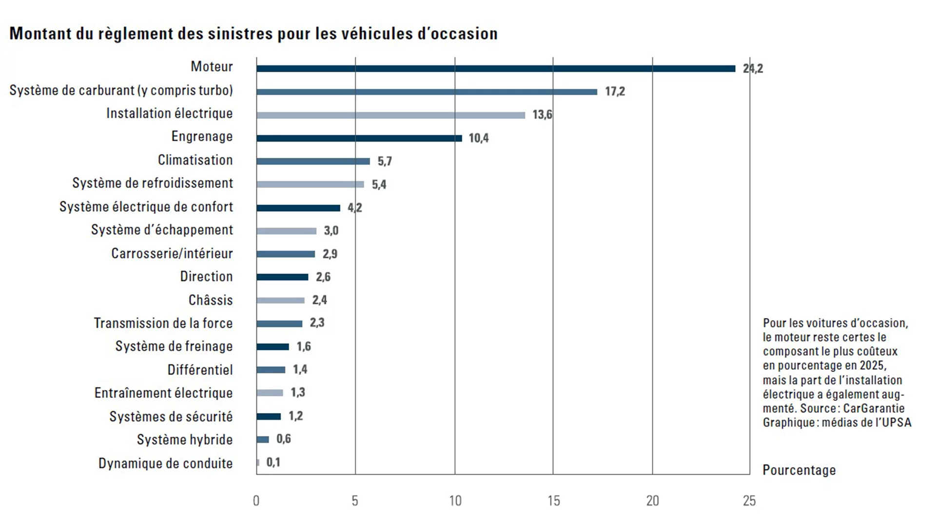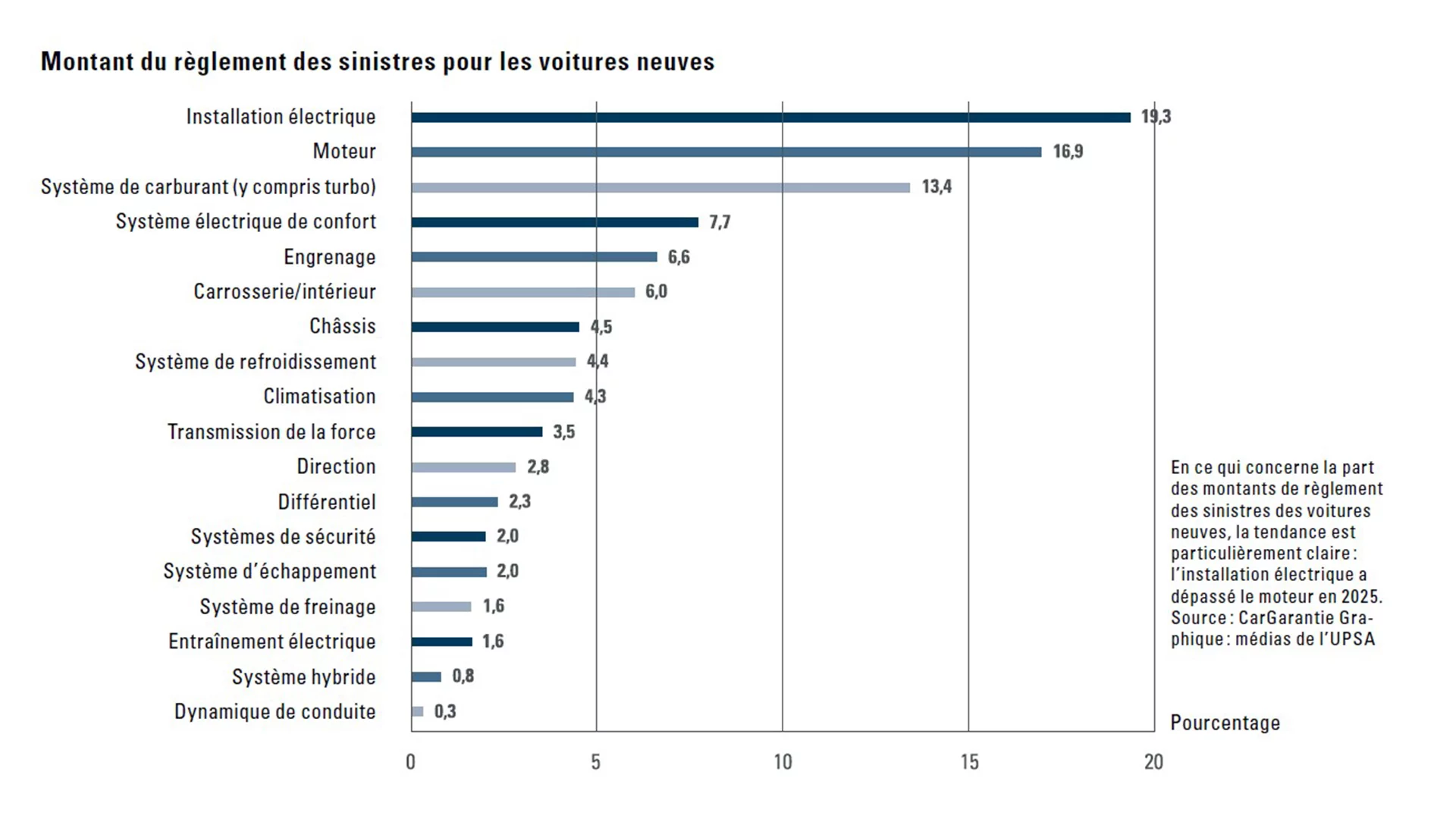 Pour les véhicules d’occasion, le moteur est resté le groupe de construction le plus coûteux, sa part dans la somme totale des règlements de sinistres était de 24,2 % en 2025, soit légèrement moins que l’année précédente (26 %). Le système de carburant, y compris le turbocompresseur, suit avec 17,2 % (17,7 % l’année précédente), tandis que le système électrique a vu sa part passer de 12,9 à 13,6 %. Pour les voitures neuves, la tendance des dernières années s’est nettement confirmée : le système électrique a atteint une part de 19,3 % en 2025, dépassant pour la première fois le moteur. Le moteur a reculé à la deuxième place avec 16,9 % (18,4 % l’année précédente), suivi par le système de carburant avec 13,4 % (15,5 % l’année précédente). La fréquence des sinistres présente également une image familière. En 2025, le système électrique est resté le sous-ensemble le plus touché, tant pour les voitures neuves que pour les voitures d’occasion.