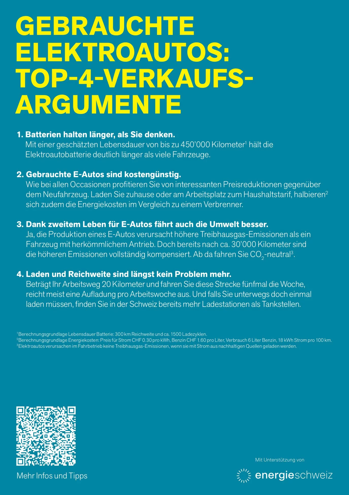 La campagne E-Occasionen met en avant les avantages des véhicules électriques d'occasion tout en renforçant la position des garages UPSA en tant qu'interlocuteurs compétents dans le domaine de la mobilité électrique.