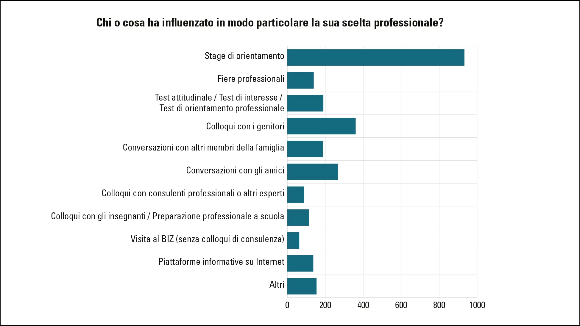 La maggior parte di loro ha scelto la professione grazie a un tirocinio di orientamento: quasi il 74% dei partecipanti ha dichiarato di aver trovato la propria attuale professione in questo modo. Altri fattori influenti sono stati i colloqui con i genitori (28%) e con gli amici (21%), seguiti dalla scuola o dall'orientamento professionale.
