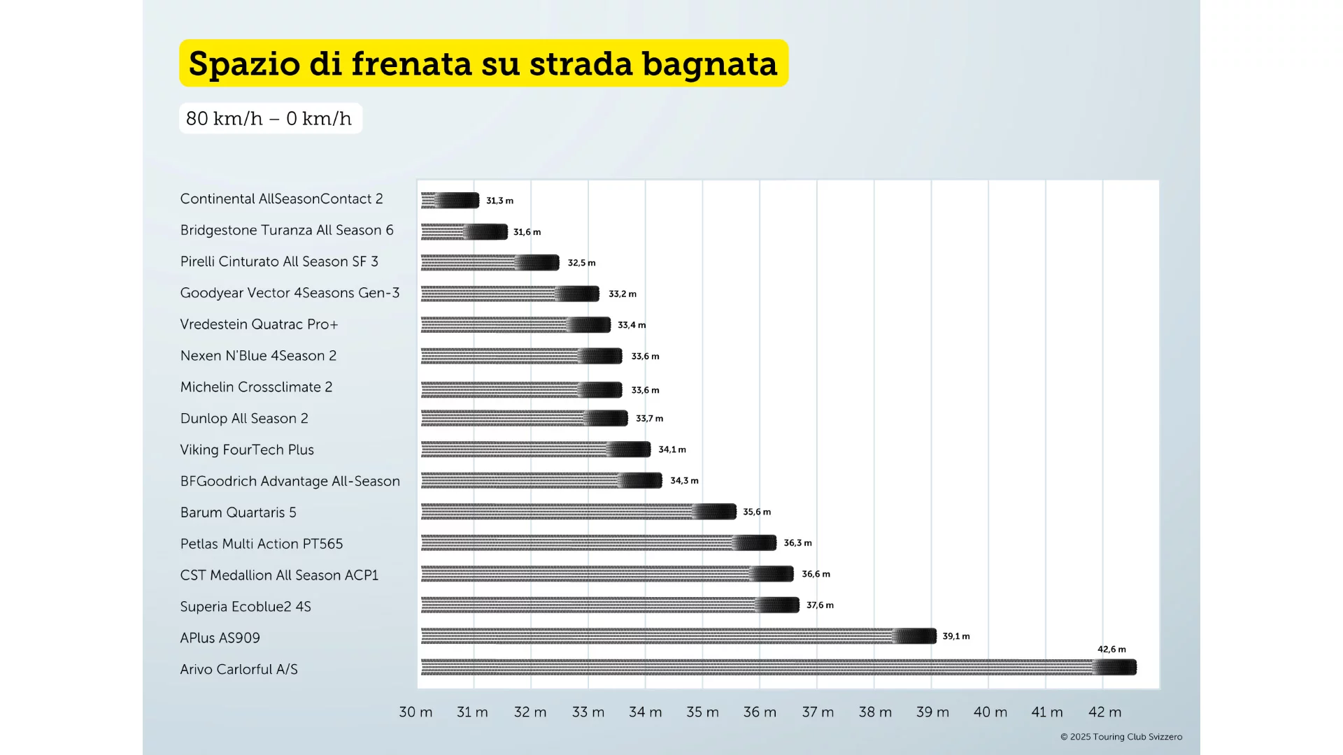 Su fondo bagnato a 80 km/h, i migliori risultati nei test di frenata sono stati ottenuti con i pneumatici Continental All Season Contact 2 e i peggiori con gli Arivo Carlorful A/S. Qui la differenza nello spazio di frenata è di 11,3 metri: quando il veicolo equipaggiato con pneumatici Continental si ferma, quello con pneumatici Arivo ha ancora una velocità residua di quasi 41 km/h, il che aumenta notevolmente il rischio di incidenti. Su strada innevata a 30 km/h, i Nexen N'Blue 4 Season 2 sono i migliori pneumatici, mentre i Petlas Multiaction PT565 sono i meno convincenti con uno spazio di frenata di 3,5 metri in più. Ciò corrisponde a una velocità residua di 16 km/h, una differenza significativa in termini di sicurezza.