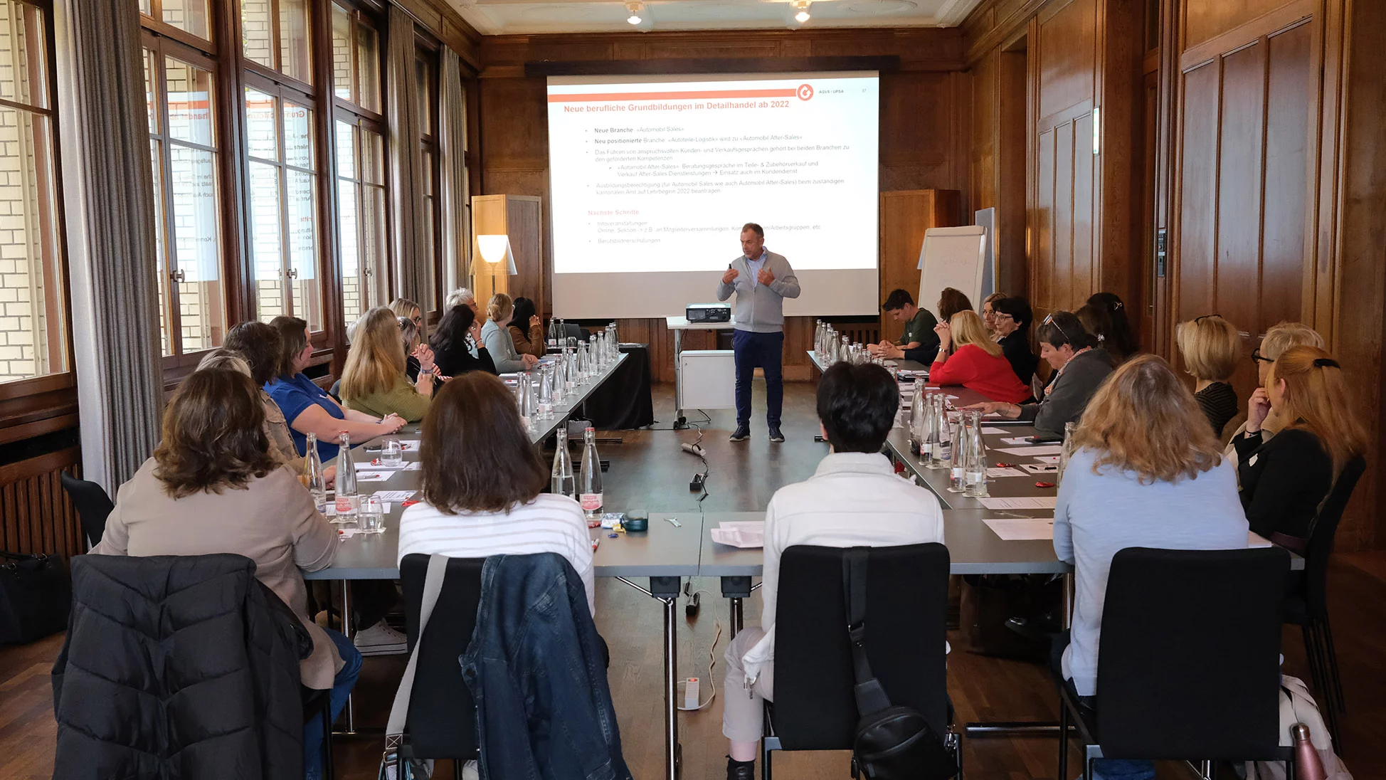 Olivier Maeder ha sottolineato che nella revisione delle professioni è necessario promuovere le competenze relative alle propulsioni alternative, senza però trascurare quelle classiche. Ha inoltre illustrato le tendenze attuali – connettività, guida autonoma, condivisione ed elettrificazione – sottolineando che queste stanno cambiando in modo sostenibile il comportamento in materia di mobilità. La tecnologia relativa alle propulsioni affascina i giovani e rende più impegnative le professioni nel campo della consulenza e dell'assistenza. Prima di pranzo, Maeder ha illustrato la formazione di base, dall'assistente die manutenzione per automobili al consulente di vendita d'automobili, e la permeabilità tra i corsi di formazione fino al livello di diplomato in economia aziendale ner ramo dell'automobile. Ha sottolineato l'importanza dell'apprendimento permanente e ha presentato i moduli didattici aggiornati e ampliati e il corso di preparazione all'esame VBV. Ciò ha riscosso grande consenso tra i partecipanti.