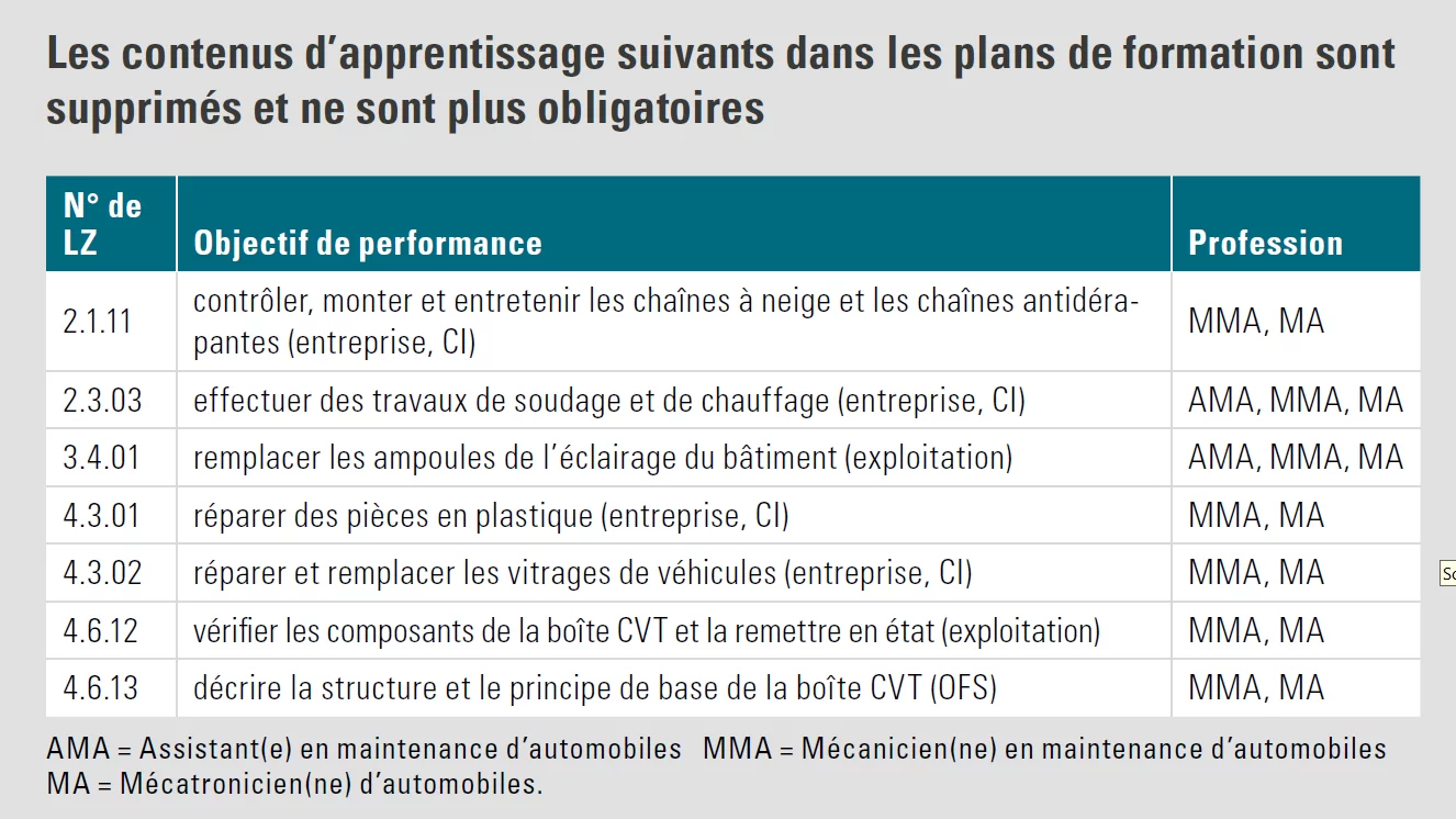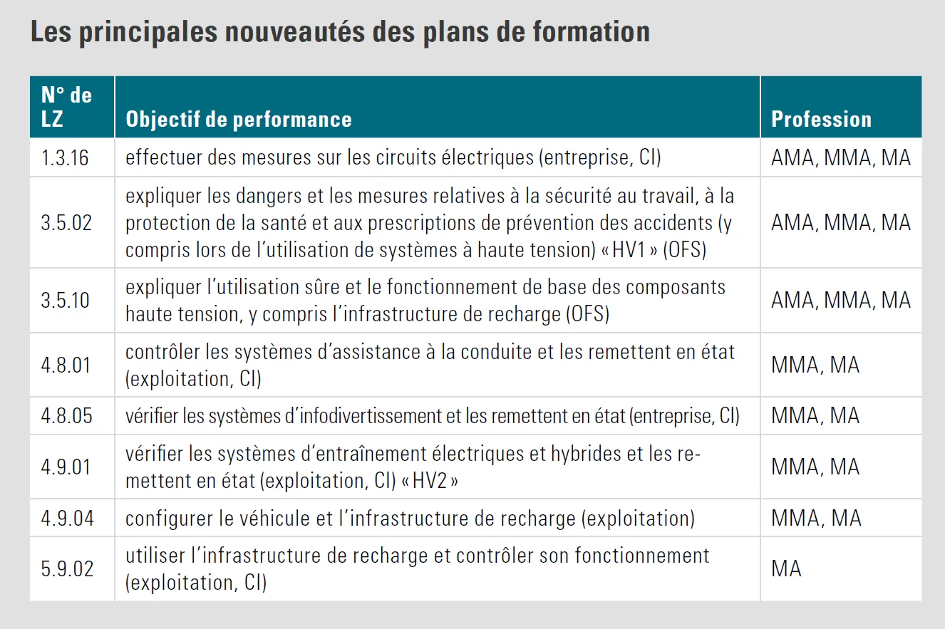La revisione parziale risponde al rapido sviluppo tecnico in settori quali la mobilità elettrica e i sistemi di propulsione alternativi. In particolare nel settore «propulsione ibrida ed elettrica», i contenuti sono stati adeguati in tutte e tre le formazioni di base. Per quanto riguarda la formazione di base, sono state aggiunte nuove competenze operative nel settore «controllo e riparazione dei sistemi». Ora gli apprendisti con formazione di base dovranno essere in grado, tra l'altro, di riparare sistemi di assistenza alla guida e di infotainment, nonché propulsioni elettriche e ibride.